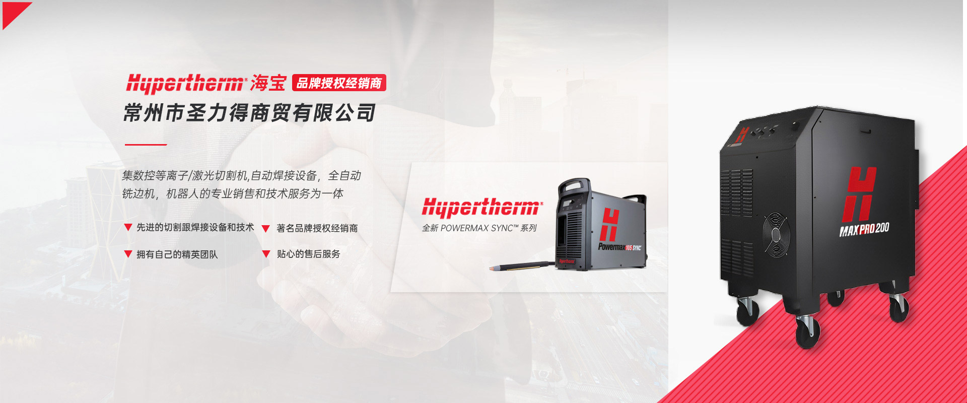常州市圣力得商贸有限公司是一家集数控等离子/激光切割机,自动焊接设备,全自动铣边机,机器人的专业销售和技术服务为一体的公司。本公司是世界品牌Hypertherm(美国海宝)公司的授权经销商?! 」臼且恢Ъ际跷榷?、服务优良、富有朝气的精英团队。公司致力于将国外先进的切割跟焊接设备和技术介绍给中国的机器制造商和终端用户,并为用户提供品质的产品和完善的售后服务。  公司主要代理以下产品:  1.美国海宝Hypertherm等离子机用电源,手持电源,原装易损件及备件  2.韩国赛拉科(CERACO)铣边机,南京顶瑞自动焊接小车  3.迈誓坦(MicroStep),日本田中(TANAKA),武汉法利莱(FARLEY-LASERLAB),江苏博大品牌等离子切割机,激光切割机及维修配件?! ?.美国海宝,美国飞马特,凯尔贝等原装正品易损件及配件  5.激光切割机,等离子切割机,火焰切割机升级,安装与调试及技术升级改造项目  6.机器人焊/切生产线  热忱欢迎广大用户前来询价及洽谈。